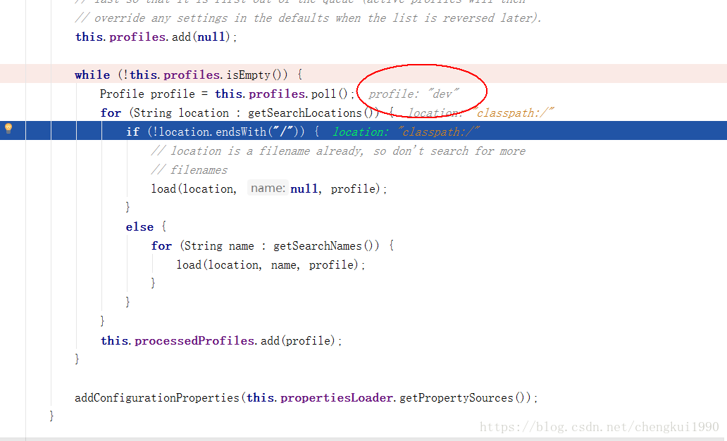 程序会先拿到这个属性,放到profiles属性中,重新去加载配置文件如application-dev.yml,程序如下: