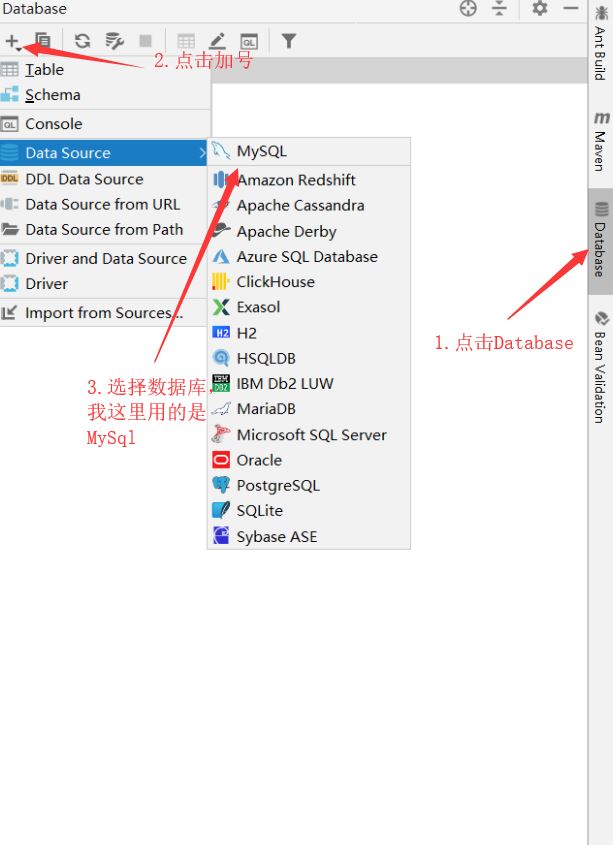 点击Idea右侧的Database,然后再点一下加号,选择你的数据库类型,我这里选择的是MySQL