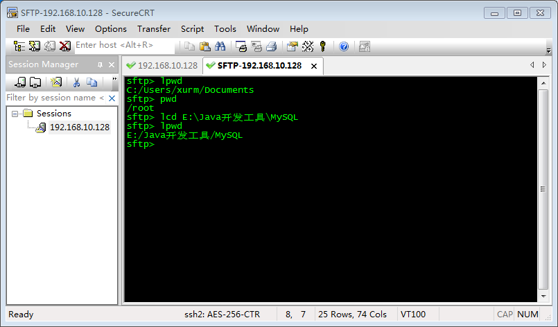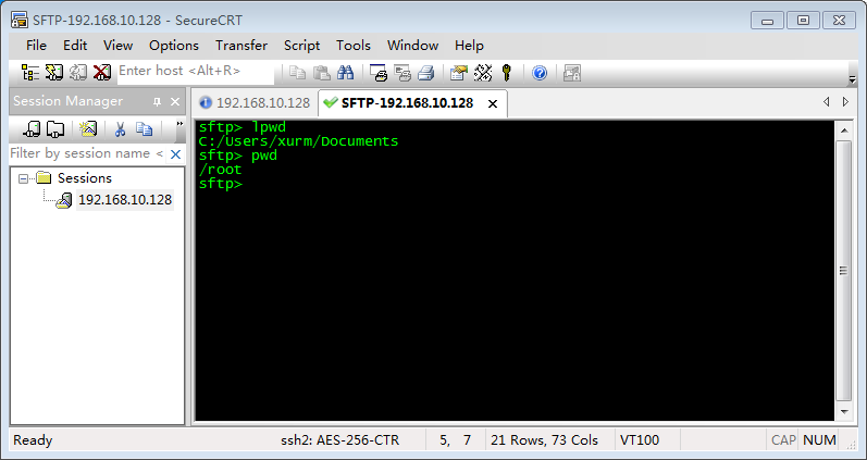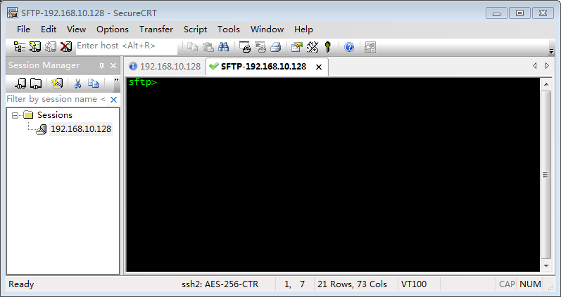 先使用SecureCRT通过SSH2协议连接上远程主机,在打开的远程终端(Terminal)窗口Tab标题页签上右键->【Connect SFTP Session】,便可打开SFTP会话窗口(SFTP即Secure File Transfer Protocol):