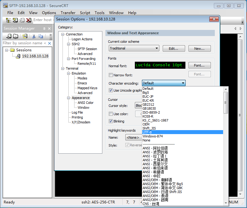 此时通过菜单Options->Session Options...打开Session Options设置对话框,左侧Category中定位到Terminal->Appearance页的Fonts区,修改Character encoding的选定值为UTF-8即可: