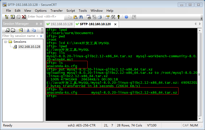 现在我们来尝试一下将远程主机/root目录那个anaconda-ks.cfg文件下载到本地当前目录,从远程主机下载文件的命令是 get :