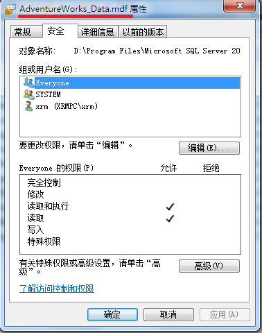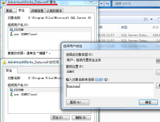 上面提到的方法中,我们都是改变了数据文件原来的权限范围(原来的权限范围只有SYSTEM即【本地系统】用户组和xrm这个系统管理员)。