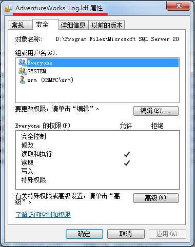 SYSTEM用户组和xrm这个管理员用户都有权限操作此数据文件和日志文件,而以SQL Server2008的超级管理员SA连接登录实例后,SQL Server却没有权限访问此数据文件。换句话说,以SQL Server2008的超级管理员SA连接登录实例后,登录的身份不在SYSTEM用户组,也不是xrm这个管理员。