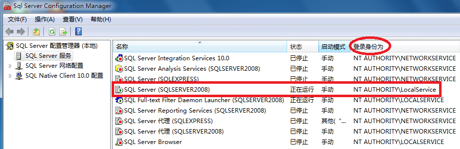 发现当前实例SQLSERVER2008的登录身份为“NT AUTHORITY\LocalService”,即操作系统授权的【本地服务】,本地服务也是了个用户组。换句话说,如果我们仅授予【本地服务】这个用户组的权限(而不是Everyone),应该也可以在SQL Server 2008中用sa的账户附加数据库了。
