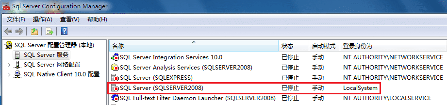 那会是什么呢? 我们查看一下当前SQL Server 2008的实例服务的相关信息就知道了,打开Sql ServerConfiguration Manager (即SQL Server 配置管理器)查看一下当前连接到的实例服务的相关信息,如下图所示: