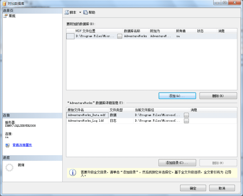 然后重启相应实例服务,重新以SA身份连接登录SQL Server 2008的相应实例并尝试附加数据库,同样可以成功的将数据库附加上!!!