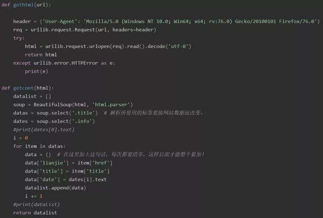 第一步使用到的模块有urllib、BeautifulSoup和sqlite3模块。其中,通过urllib模块爬取目标网页html数据;通过BeautifulSoup模块解析网页数据、爬取网页内容;通过sqlite3模块建立目标网站已有通知数据库。