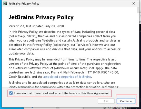 这里是JetBrains 隐私政策,我们勾选 我已阅读并同于条款 ,然后继续( Continue )