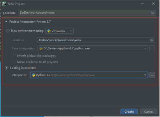配置 Location(项目路径)至 D:\Dev\workplace\imooc(自定义)。 这里有一个需要注意的是 Project Interpreter(项目的 Python 运行环境),这个如何后面熟悉了可以直接选择 New environment using , PyCharm 会帮我们生成一个项目的虚拟执行环境。