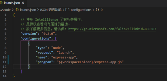 我们看到 .vscode/launch.json的configurations.program属性为 "${workspaceFolder}/express-app.js" ,表示调试的入口文件,其中 workspaceFolder