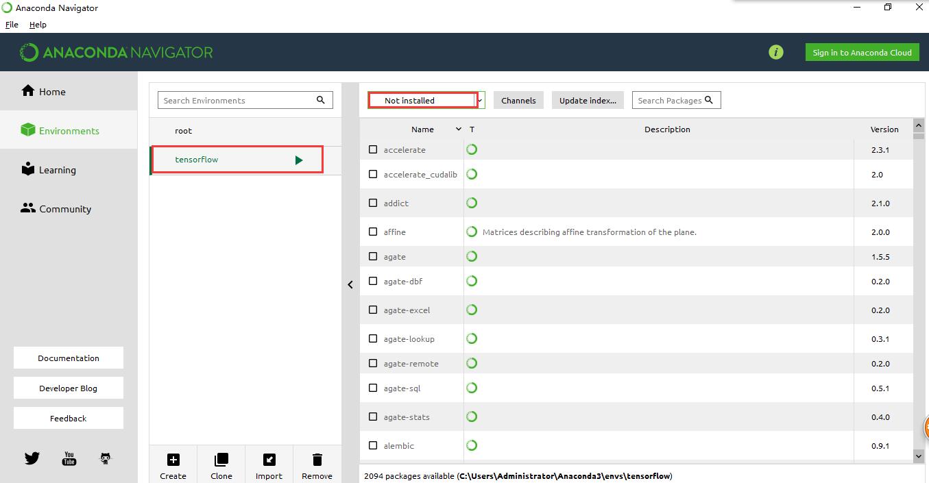 运行 开始菜单->Anaconda3—>Anaconda Navigator,点击左侧的Environments,可以看到tensorflow的环境已经创建好了。