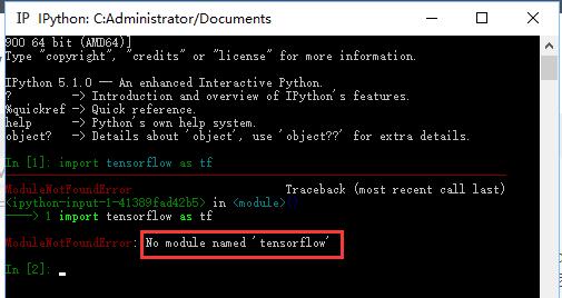 或许到这里我们并没有满足,我们在Anaconda自带的ipython 和Spyder中import tensorflow的时候一直失败,提示 No module named ‘tensorflow',如下图,那是因为我们没有在tensorflow的环境下打开它们。
