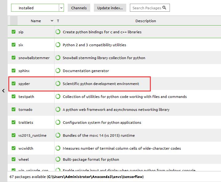 切换到installed,可以看到两个都已经安装好,其实可以按照自己的需要安装。下图显示已经安装好的Spyder:
