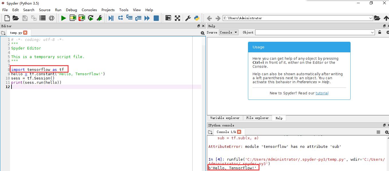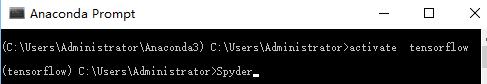 同样,在Anaconda Prompt中启动tensorflow环境,并运行Spyder,等一会儿后会启动Spyder IDE,import tensorflow 同样成功: