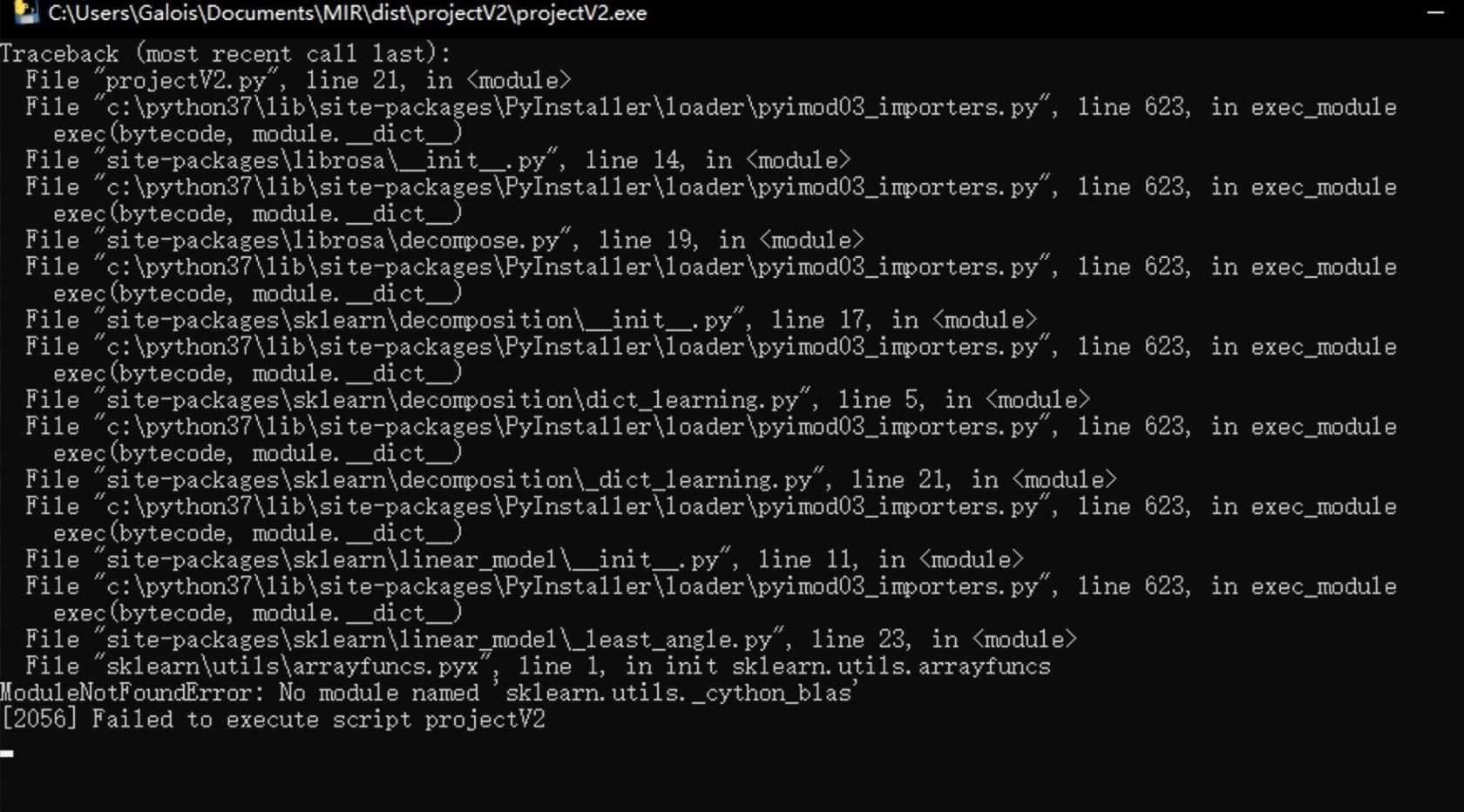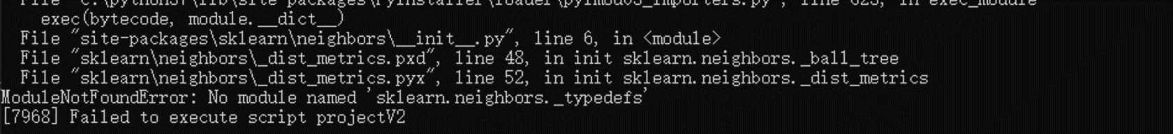 我们可以看到这个问题被解决了,但是会有新的问题,基本都是 sklearn 的问题,这里只是枚举我发生的问题,如果你写的是别的项目,库依赖也很严重,也会有这些问题,可能不是 sklearn,总之肯定是某个包缺失依赖文件或模块文件的问题。