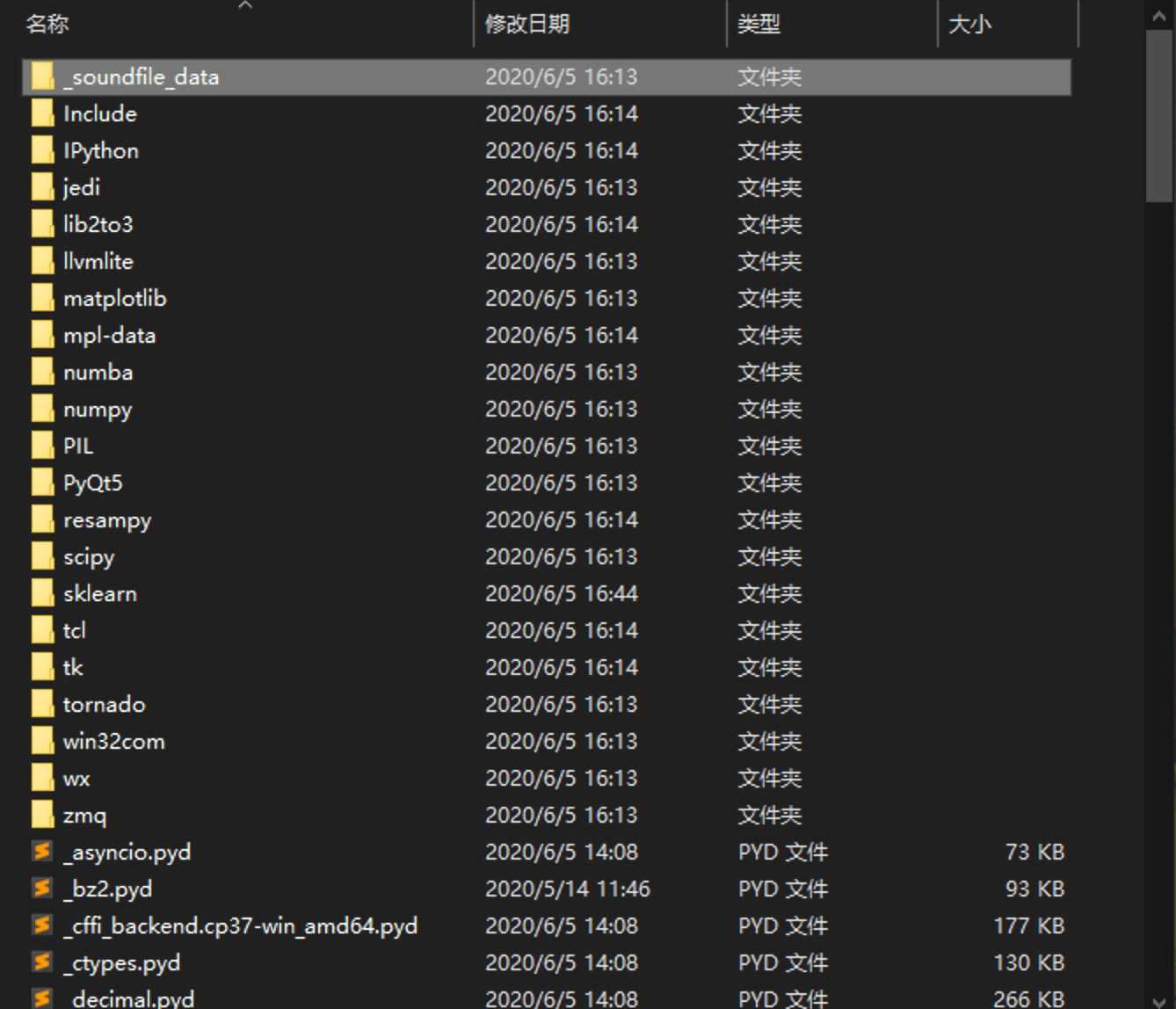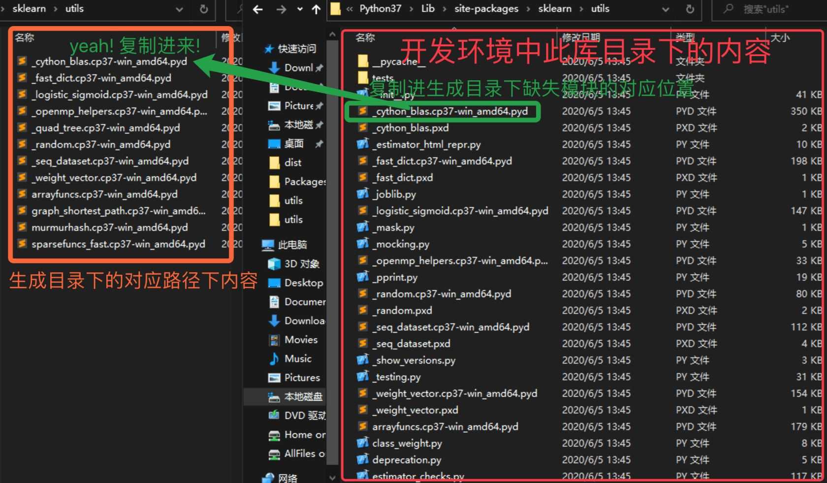 我们可以看到报错中的缺失模块 ‘sklearn.utils._cython_blas' 的模块文件在这里其实被命名成了 _cython_blas.cp37-win_amd64.pyd,就是它了。