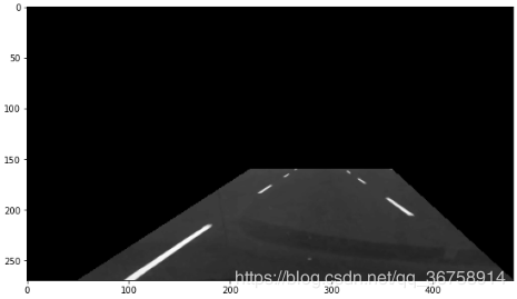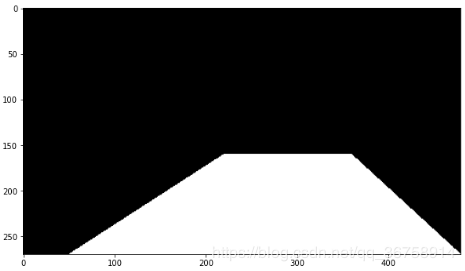 # 创建0矩阵 stencil = np.zeros_like(col_images[idx][:,:,0]) # 指定多边形的坐标 polygon = np.array([[50,270], [220,160], [360,160], [480,270]]) # 用1填充多边形 cv2.fillConvexPoly(stencil, polygon, 1) # 画出多边形 plt.figure(figsize=(10,10)) plt.imshow(stencil, cmap= "gray") plt.show()