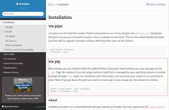 我们先回到 Virtualenv文档 ,左侧菜单进入 用户指南 > 介绍 有这么一段