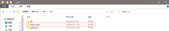 查看路径 D:\Dev\env 下就有了 我们刚刚创建的 imooc_venv 项目运行环境