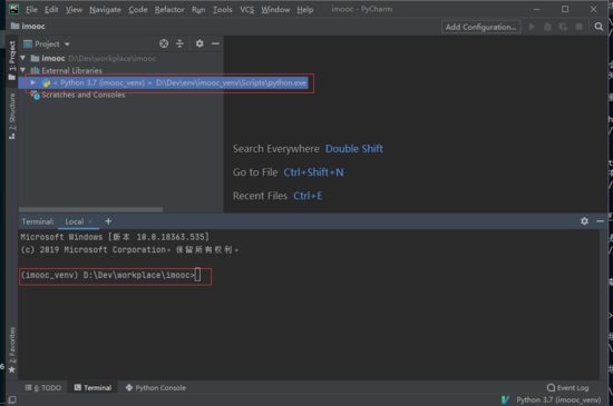 等环境重新加载完成后,External Libraries(外部依赖类库)会变成 「 imooc_venv 」 ; 重启 Terminal (PyCharm 命令行工具)会加上 (imooc_venv) 代表在虚拟环境中