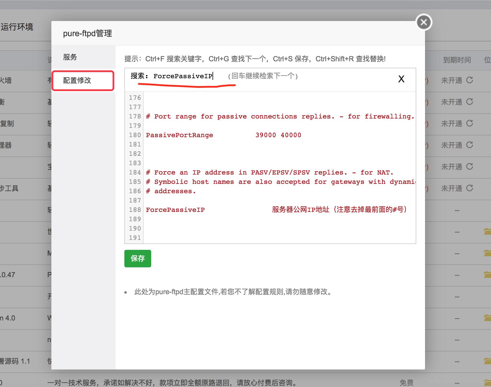 第二步:点击配置修改:如图所示,查找“ForcePassiveIP”(位置188行左右),搜索:
