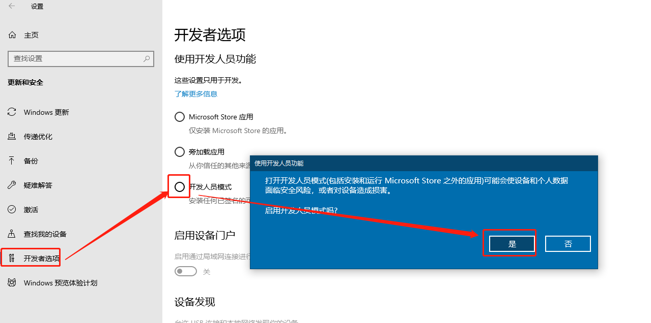 设置-->更新和安全-->开发者选项-->开发人员模式