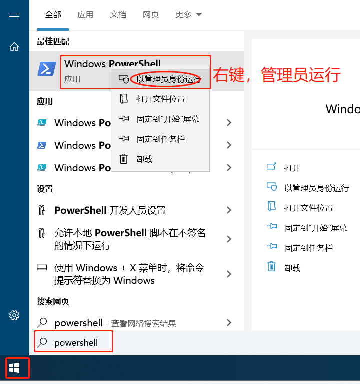 按下 Windows 键,搜索 PowerShell 右键,以管理员身份运行