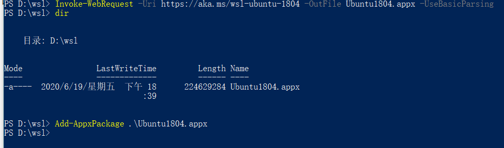 Invoke-WebRequest -Uri https://aka.ms/wsl-ubuntu-1804 -OutFile Ubuntu1804.appx -UseBasicParsing