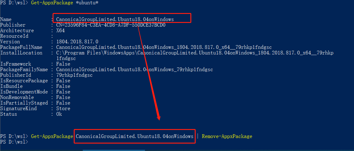 Get-AppxPackage CanonicalGroupLimited.Ubuntu18.04onWindows | Remove-AppxPackage