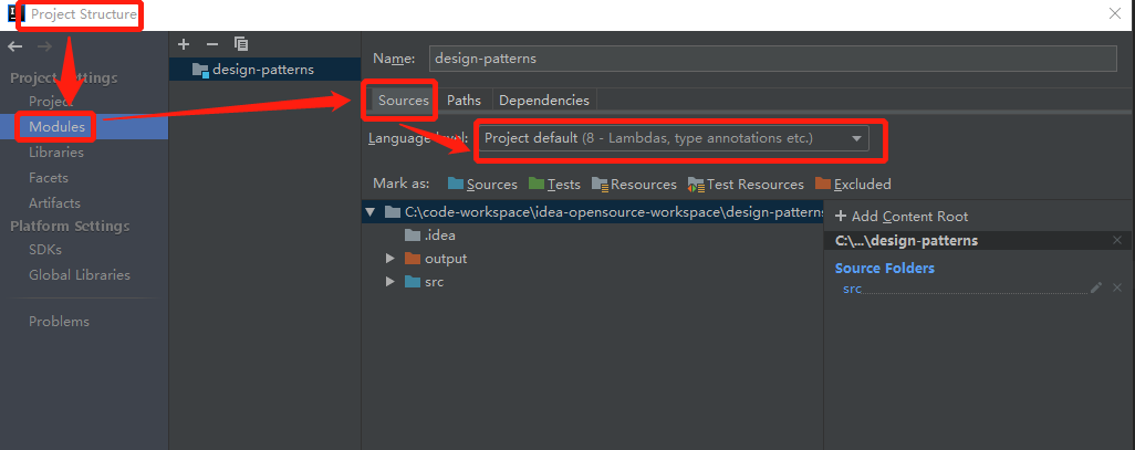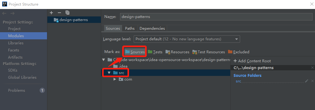 在 Modules ==》Sources 中设置Sources目录: