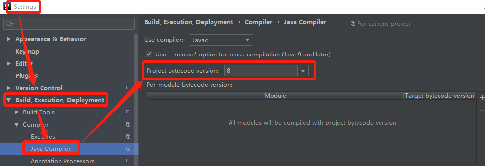 4.1、Settings ==》Build,Execution,Deployment ==》 Compiler ==》Java Compiler 设置为Java 8(本地使用的版本)