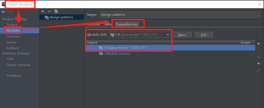 4.4、Project Structure ==》 Modules ==》 Dependencies设置为Java 8(本地使用的版本)