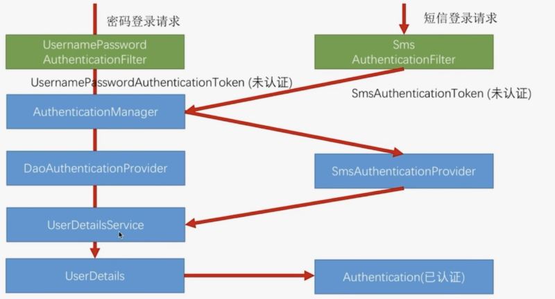 我们自己搞了上面三个类以后,想要实现的效果如上图所示。当我们使用短信验证码登录的时候: