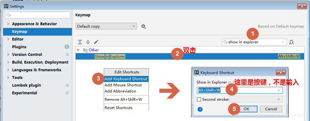 操作:操作:setting > Keymap > 输入 show in explorer 查找 > 双击目标项 > 点击Add Keyboard Shortcut > 按下键盘上的 Alt Shift W 然后确定即可