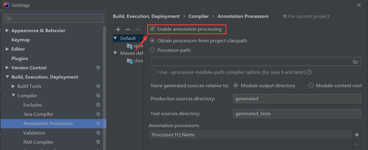 2. 启用了 Annotation processing,启用方法:File => Settings => Build, Execution, Deployment => Compiler => Annotation Processors => Enable annotation processing(如图)