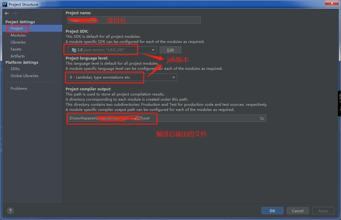 第二步:配置项目名称,jdk,编译后的文件路径,out路径自己建的。
