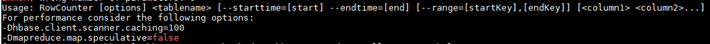 # RowCounter扫描t1 hbase org.apache.hadoop.hbase.mapreduce.RowCounter t1 #用CellCounter扫描t1表并将结果写入HDFS的/tmp/t1.cell目录 hbase org.apache.hadoop.hbase.mapreduce.CellCounter t1 /tmp/t1.cell