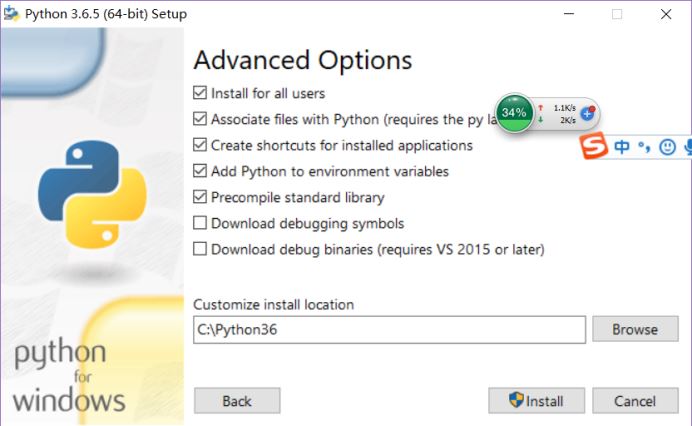 点击“next”下一步,勾选“Install for all users”和“Add Python to environment variables”这两个都要勾选上。推荐是,直接在C盘上创建的Python36下安装,这样以后找就能很容易直观找到,若安装失败,把问题贴到搜索引擎上找答案。