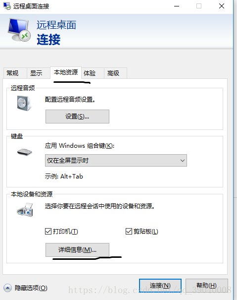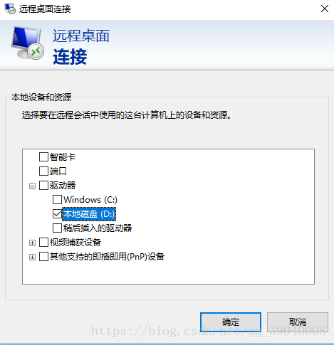 (为了方便我们之后软件的安装我个人推荐在第一次连接时在远程会话中使用本地资源)