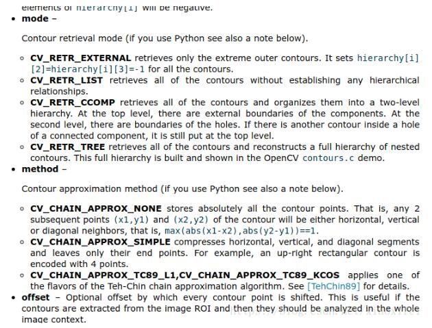 然后使用findContours,用来获得二值化图像的轮廓信息,findContours中cv2.RETR_EXTERNAL是表示轮廓获取方式,是表示内圈的轮廓不需要进行获取,cv2.CHAIN_APPROX_NONE表示是轮廓曲线记录的方式,CHAIN_APPROX_NONE表示记录所有的轮廓点,具体的参数说明可以参看: