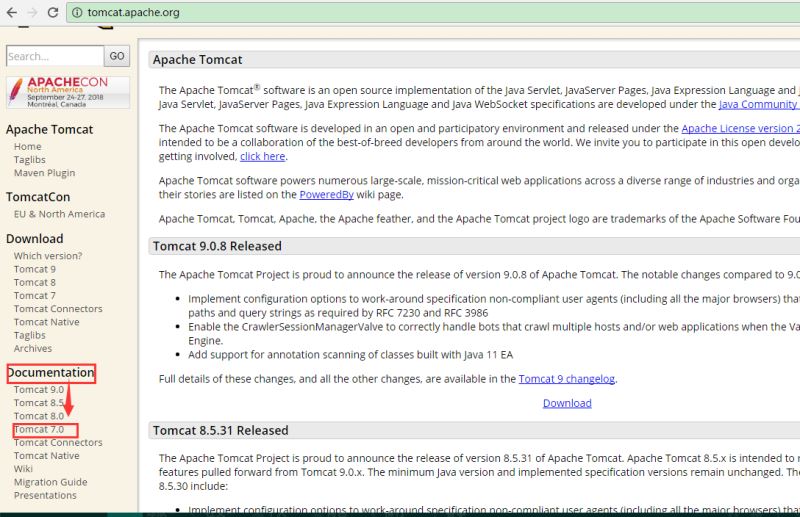 总结:想着昨天出现的这个问题,今天休息正好可以总结一下,接着去看Tomcat官网上的相关文档,去看下这个问题。如今Tomcat版本更新很快,很多Tomcat7的版本不再好找,我们可以查看最新的Tomcat7版本信息,打开Tomcat官网后,查看