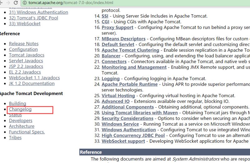 那么我们怎么看Tomcat历史版本的变化呢,回到刚开始进来的文档首页,点击最下方的Changelog部分,