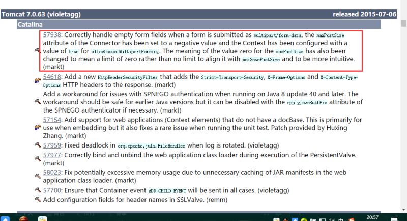 这里面是Tomcat7所有的历史版本的变化,我们找到Tomcat 7.0.63版本,可以看到变化的第一项就是关于maxPost属性的内容,上面的博客的哥们果然是满满的干货,虽然内容少,但是一击必中啊。