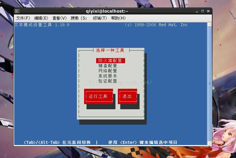 首先是虚拟机的Ip地址的问题 有的童鞋在装入系统后发现无法连接 可能是因为网卡没有打开(大雾),反正就是 输入ifconfig后在我上面划红线的地方没有Ip地址,对视完全没有ip地址 这TM就很尴尬了。此时你一定是连不上网的。我们首先需要的是设置ip 在虚拟机中的终端输入setup如果你是第一次登陆他可能会需要你输入密码 没问题就是你的登陆密码直接输入即可。(同时这里说明一个问题,但是大家不改密码所以没啥区别其实登录密码和root密码是有区别的)这时会变成图形界面如下图