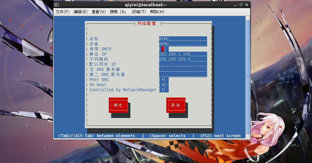 这里鼠标不能使用需要使用键盘在移动到网络配置然后回车,选择第二个设备配置 然后回车选择第一个设备回车。这时会出现下面这个界面