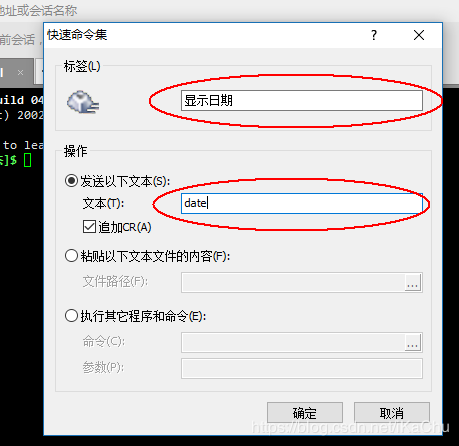 第三步:在弹出的快速命令集对话框中,为你的快捷键取一个名字,并设置对应要执行的命令,例如“显示日期”,对应要执行的命令是date。