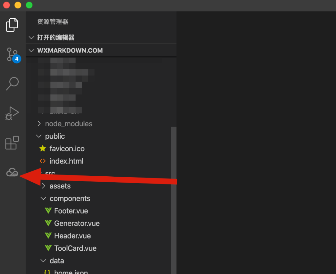 单击左侧导航栏的图标,打开已安装好的 Tencent CloudBase Toolkit 插件: