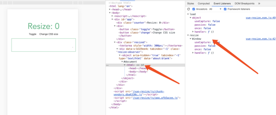 其中id为resized是我们要监听的元素,class为resize-observer是组件生成的dom,但是我们的resize监听不是挂载在上面,是里面的object的吗,也不是,而是在object里面的window里面,有点类似于iframe,这样做有什么好处呢,相当于我们把resize的监听放到一个sandbox里面,不受外层的干扰,而对于上层来说,我只需要监听resize就好了,而不用担心它被篡改