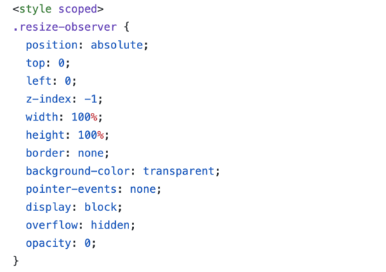 同时我们看下它的样式,scoped和宽度高度跟父元素一样没什么好说的了,我们需要注意的是,z-index为-1,background-color: transparent;pointer-events: none;opacity:0,基本把各种可能的结果都考虑进去了