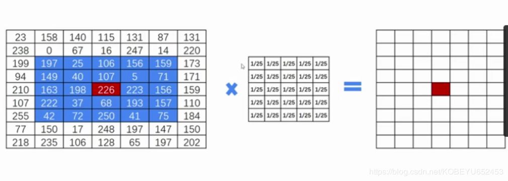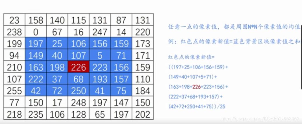 如图:如果我们想对红色点进行处理,则它新值等于周围N乘N个像素点的平均(包括自身)